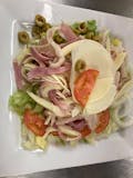 Prepared with lettuce, tomatoes, green olives, onions, topped with ham and provolone cheese.